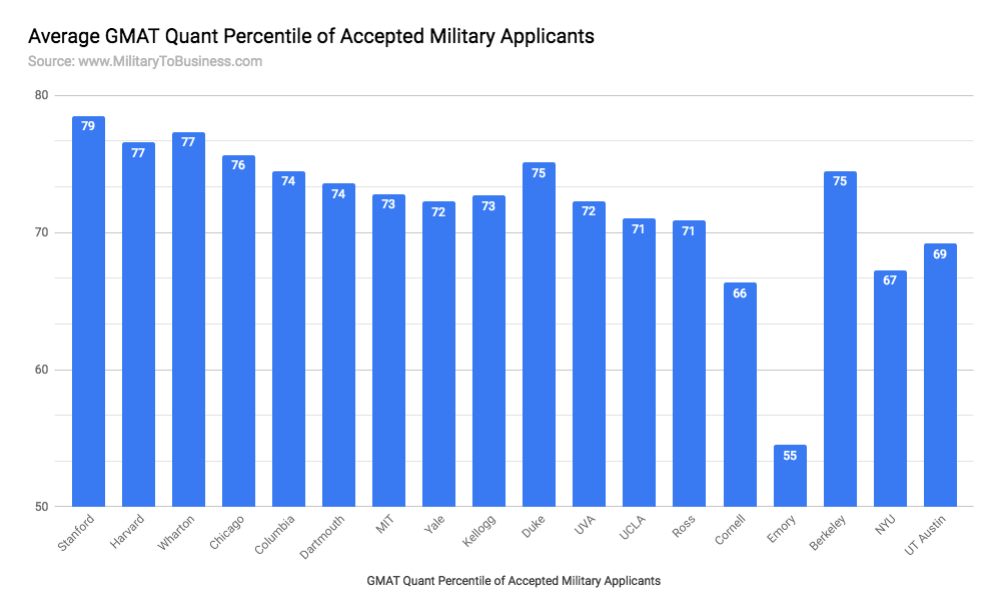- Similar to overall GMAT, there is a tight banding of quant GMAT averages for accepted military applicants. All top 10 programs are within a 7 percentile range (72 - 79 percentile). The top 3 programs averaged 77 percentile while other schools averaged closer to 73 percentile. Still, not a huge difference.