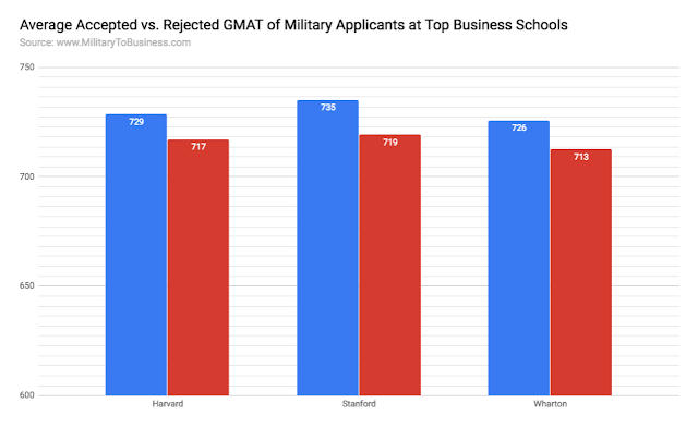 Another element that jumps out is that in the 9+ year history of MilitaryToBusiness, we've never seen an applicant accepted to any program with a score below 610. I'm sure this has happened to others out there, we have just never seen it. Perhaps those applicants are less likely to use a consulting service because we also haven't seen many prospective clients with those scores. When we do, we usually insist that they retake the GMAT.